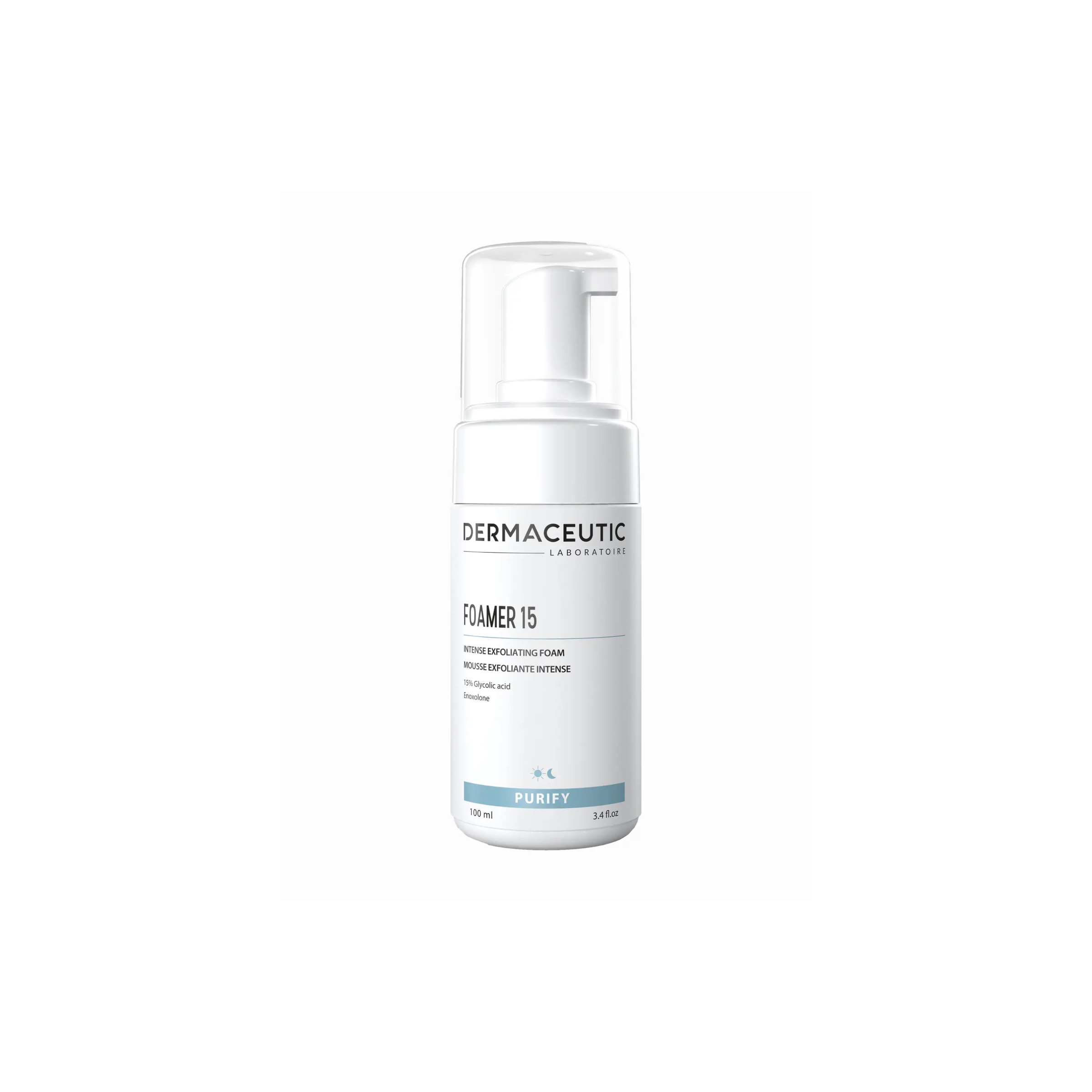 Dermaceutic Foamer 15 (100ml) is an exfoliating foaming cleanser that effectively removes impurities and dead skin cells to help improve dull complexion and irregular texture. Suitable for mature sun-damaged skin and oily, acne-prone skin. Not for sensitive or rosacea-prone skin.